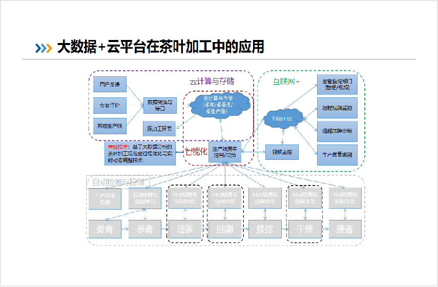 控制系統(tǒng)通過(guò)對(duì)茶葉加工生產(chǎn)線數(shù)字化管理與數(shù)據(jù)處理技術(shù)的研究,進(jìn)一步提升茶葉加工生產(chǎn)線的數(shù)字化管理水平,并通過(guò)加工品質(zhì)在線監(jiān)測(cè)與反饋實(shí)現(xiàn)一葉一策的加工模式,通過(guò)加工大數(shù)據(jù)的處理與分析為工藝優(yōu)化與設(shè)備改進(jìn)提供支撐。